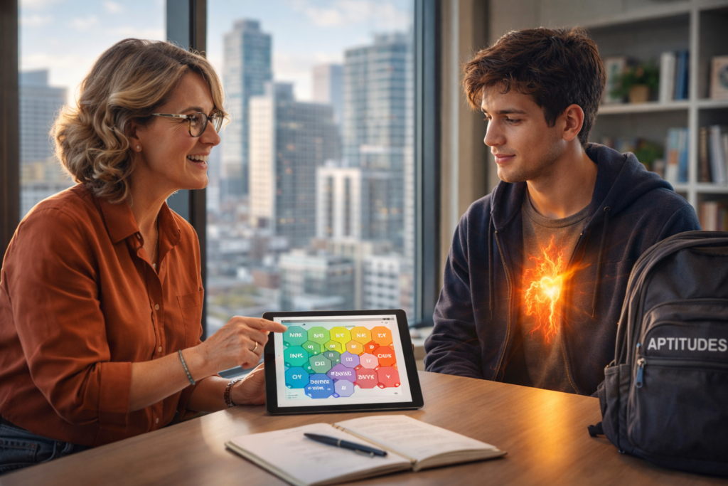 Históricamente, la orientación se ha basado en medir aptitudes (para qué eres bueno) e intereses (qué te gusta). Sin embargo, en un mundo donde la Inteligencia Artificial puede replicar casi cualquier aptitud técnica, estas métricas se quedan cortas. Aquí es donde el MBTI (Myers-Briggs Type Indicator) marca la diferencia.